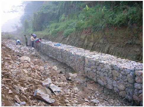(5) 較好的柔韌性。石籠網(wǎng)片的原材料可采用涂膜熱鍍鋅低碳鋼絲,構(gòu)成網(wǎng)格的鋼絲有一定的強(qiáng)度,不易被拉斷,箱籠整體強(qiáng)度較高。低碳鋼絲承受適度的變形特點(diǎn),可以將全部工程連成整體,不需分縫,即使由于某種原因使結(jié)構(gòu)中斷裂一根網(wǎng)絲,也不會影響結(jié)構(gòu)的整體性。特別在受地基土沉陷或墻后土有小的變形影響時,結(jié)構(gòu)能進(jìn)行自身適應(yīng)性的微調(diào),不會因不均勻沉陷而產(chǎn)生沉陷縫等,整體結(jié)構(gòu)不會遭到破壞。