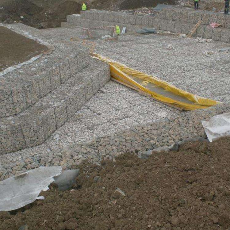 石籠網(wǎng)由高抗腐蝕、高強度、具有延展性的低碳鋼絲或者包覆PVC的以上鋼絲使用機械編織而成,使用該網(wǎng)制作而成的箱型結構就是石籠。根據(jù)ASTM和EN標準,所使用的低碳鋼絲直徑根據(jù)工程設計要求而不同。一般介于2.0-4.0mm之間,石籠網(wǎng)鋼絲的抗拉強度不少于38kg/m2,金屬鍍層重量一般高于245g/m2,石籠網(wǎng)片的邊緣線直徑一般要大于網(wǎng)線直徑。其雙線絞合部分的長度不得小于50mm.以保證絞合部分鋼絲的金屬鍍層和PVC鍍層不受破壞。