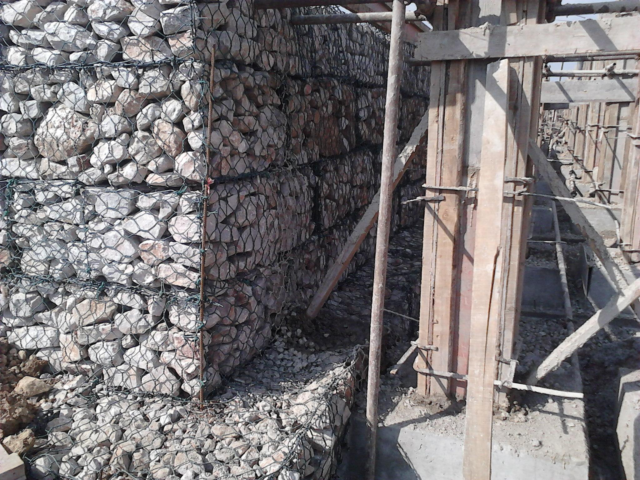 2、石籠網(wǎng)箱裝石:必須同時(shí)向同層網(wǎng)箱格內(nèi)均勻地放入石料,不能將單格網(wǎng)箱一次性投滿;填料時(shí)應(yīng)分層投料,毎層投料厚度控制在30cm以下;頂部填充石料立高出石籠網(wǎng)箱2~3cm,空隙處應(yīng)以適當(dāng)?shù)男∷槭钊軐?shí),增加石籠網(wǎng)箱的容重;填充石料容重應(yīng)達(dá)1.90t/m3;填充石料時(shí),表面應(yīng)以人工碼放壘平,石料平面朝外。