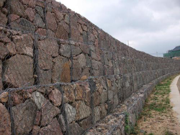 賓格網(wǎng)(石籠、石籠網(wǎng)箱、格賓網(wǎng)、生態(tài)網(wǎng)箱、格賓網(wǎng)箱、六角網(wǎng)箱、固濱網(wǎng))由各種網(wǎng)孔規(guī)格的格賓網(wǎng)片按照ASTM A975-97規(guī)范組裝而成。工程現(xiàn)場填充石料組裝形成柔性的、透水的、整體的支擋結(jié)構(gòu),用于生態(tài)防護(hù)工程。網(wǎng)絲采用高鍍鋅鋼絲或者10%鋁鋅合金鋼絲,如果環(huán)境條件比較惡劣,污染比較嚴(yán)重,可以在鋼絲的表面涂塑(PVC),以增強(qiáng)網(wǎng)絲的抗腐蝕性能。