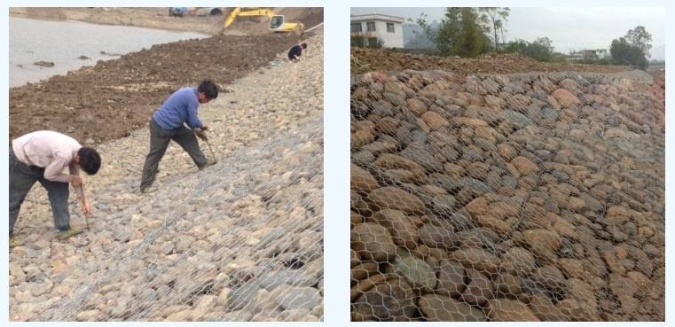 將網(wǎng)籠錯(cuò)縫擺設(shè)就位,避免出現(xiàn)縱向貫通縫。將網(wǎng)籠四邊立起,用綁線將相鄰邊沿扎緊,在綁扎過(guò)程中避免高鍍鋅損傷。