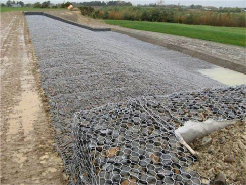 雷諾護(hù)墊是指由機(jī)編雙絞合六邊形金屬網(wǎng)面構(gòu)成的厚度遠(yuǎn)小于長(zhǎng)度和寬度的墊形工程構(gòu)件,其中裝入塊石等填充料后連接成一體,成為主要用于水利堤防、岸坡、海曼等的防 沖刷結(jié)構(gòu),具有柔性、對(duì)地基適應(yīng)性的優(yōu)點(diǎn)。