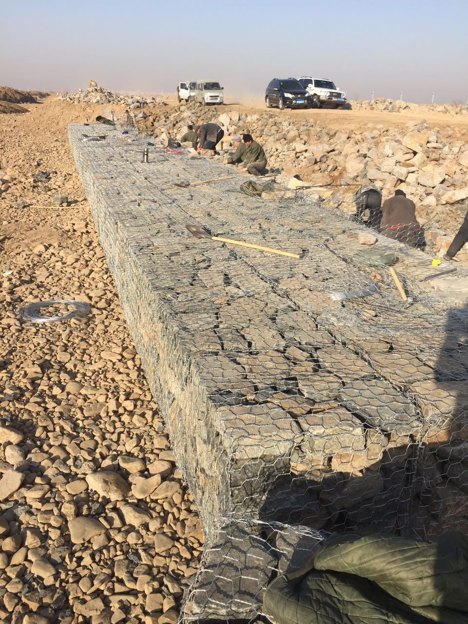 3、封蓋:封蓋時頂部石科必須砌壘平整,先固定每端相鄰邊節(jié)點后再綁扎,封蓋與網(wǎng)箱邊框相交線處每隔l0-15cm綁扎一道。毎層石籠網(wǎng)箱填石完成應(yīng)擇點測量標(biāo)高,達(dá)到設(shè)計要求。